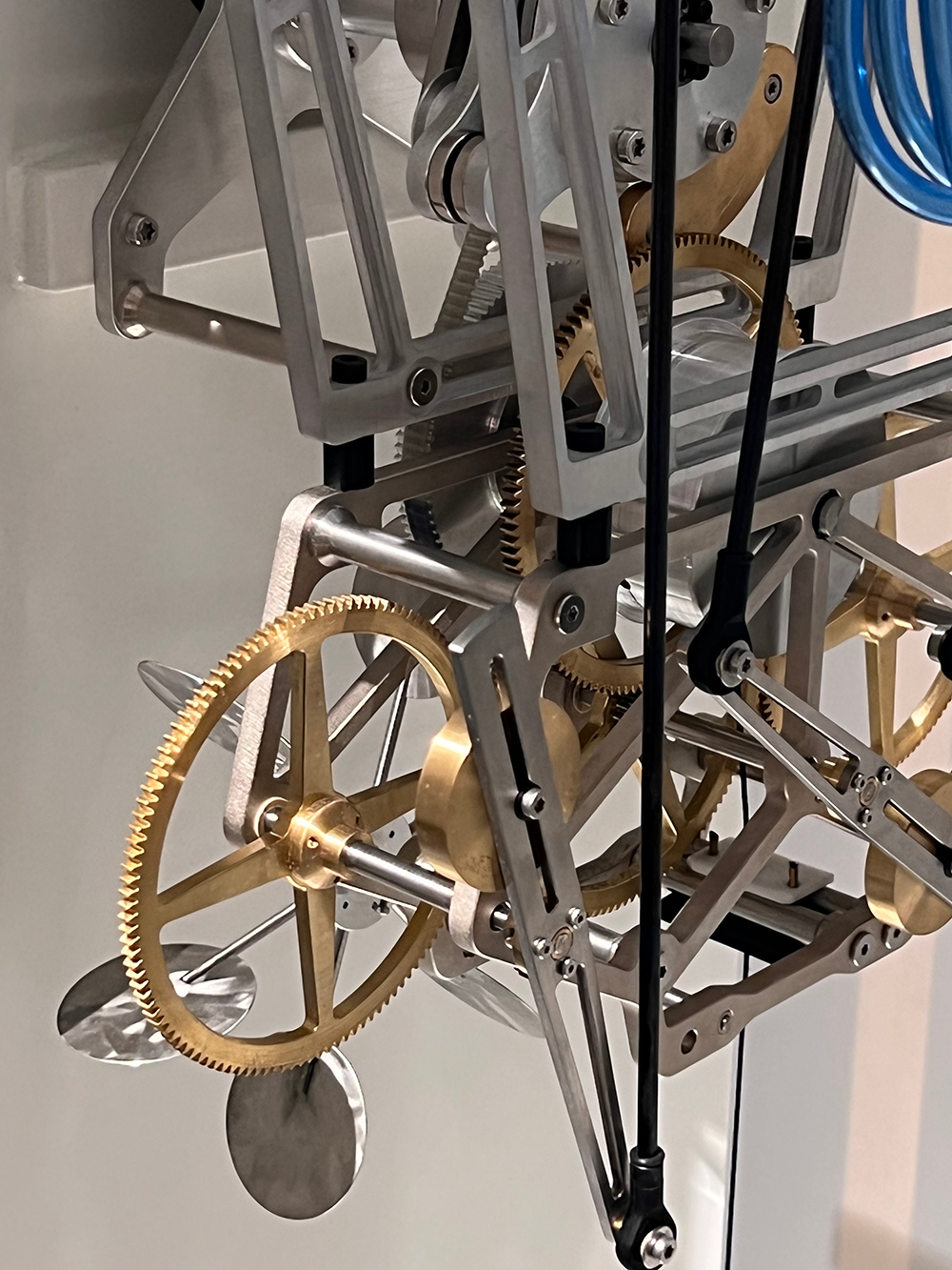 This automaton features a mechanical arm trying to touch a small bird. The bird’s shape and finish are reminiscent of the automata inside clocks and music boxes made in the region. Whenever the arm gets too close, the bird moves out of reach and immediately hides under a trap… only to reappear and for this game of hide-and-seek to begin again. This interaction between the two figures, which have been 3D-printed in titanium, is made possible simply by a series of cams: parts that transmit and transform the movement of a mechanism. The metal figures’ specific, asymmetrical shape produces a completely random rhythm which makes the scene all the more realistic and amusing.